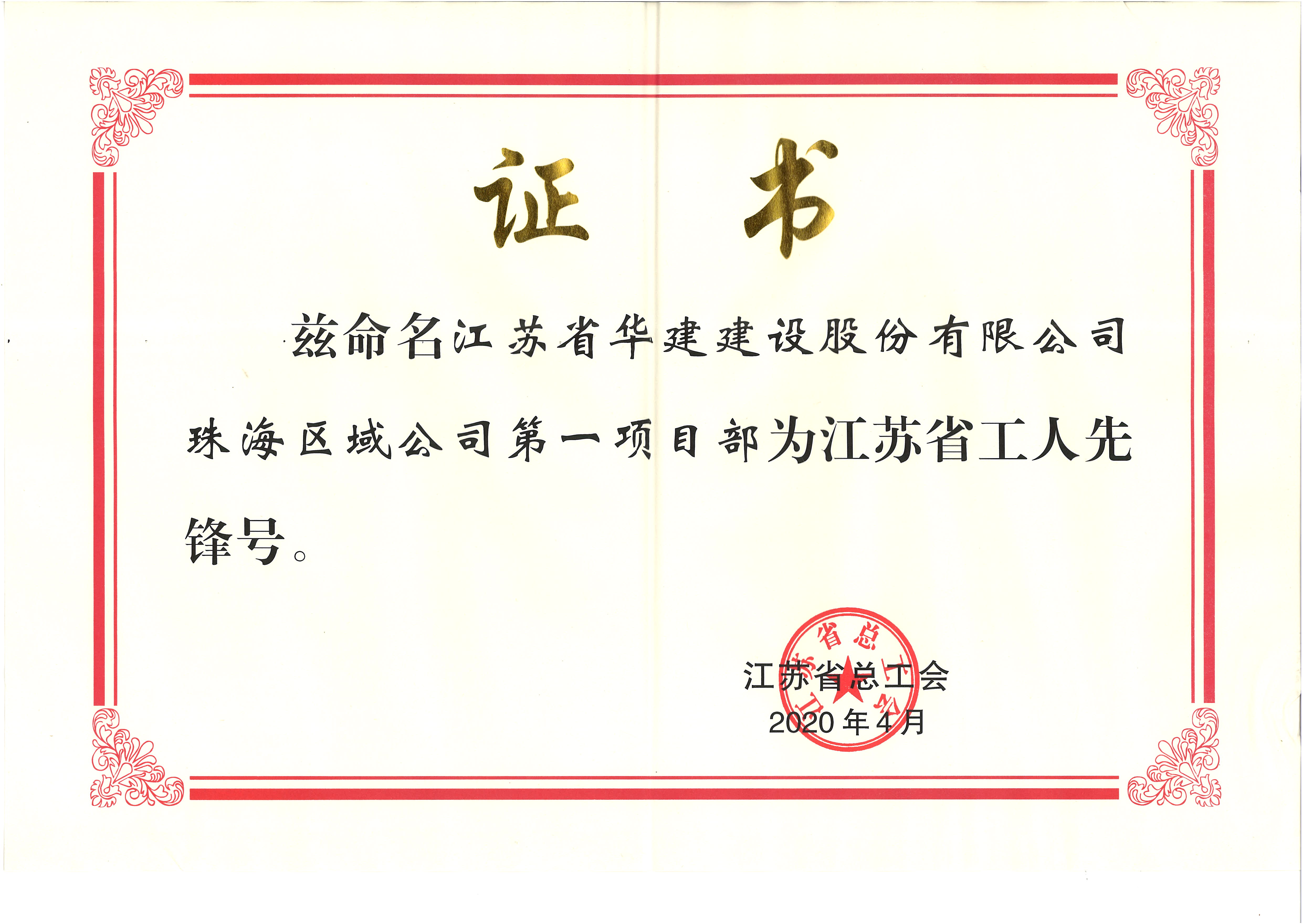 珠海区域公司第一项目部获江苏省工人先锋号